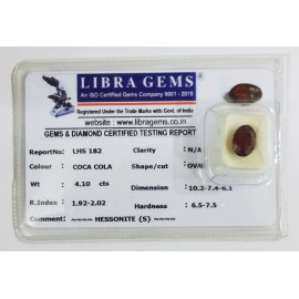 REPORT.NO.-LHS 182CLARITY.-N/ACOLOUR.-COCA COLASHAPE/CUT.-OVALWT.-4.10 CTSDIMENSION.-10-2.7-4.6-1.R.INDEX.-1.92-2.02HARDNESS.-6.5-7.5COMMENT.-HESSONITE { S }..