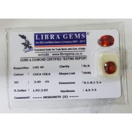 REPORT NO . LHS 40CLARITY . N/ACOLOUR . COCA COLASHAPE / CUT . ROUNDWT . 3.40 CTSDIMENSION . 9-1.8-1.5-4.R . INDEX . 1.92-2.02HARDNESS . 6.5-7.5COMMENT . HESSONITE { S }..