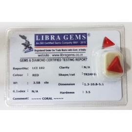 REPORT NO . LCI 102CLARITY . N/ACOLOUR . REDSHAPE / CUT . TRIANGLEWT . 3.58 CTSDIMENSION . 1-3.10-8.5-1.R . INDEX . N/AHARDNESS . 3.5COMMENT . CORAL..