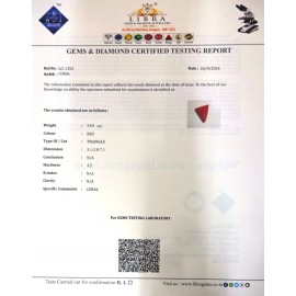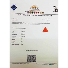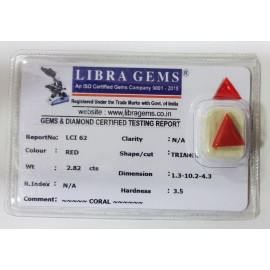 REPORT NO. LCI 62CLARITY. N/ACOLOUR. REDSHAPE/CUT. TRIANGLEWT. 2.82 CTSDIMENSION. 1.3-10.2-4.3R. INDEX. N/AHARDNESS. 3.5COMMENT. CORAL..