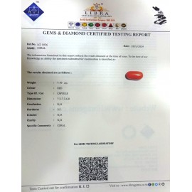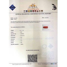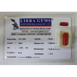 REPORT NO . LCI 286CLARITY . N/ACOLOUR . REDSHAPE / CUT . CAPSULEWT . 3.81 CTSDIMENSION . 4-9.5-1.5-1.R . INDEX . N/AHARDNESS . 3.5COMMENT . CORAL..