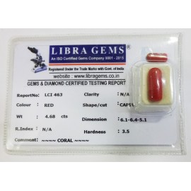 REPORT.NO.-LCI 463CLARITY.-N/ACOLOUR.-REDSHAPE/CUT.-CAPSULEWT.-4.68 CTSDIMENSION.-6-1.6-4.5-1.R.INDEX.-N/AHARDNESS.-3.5COMMENT.-CORAL..