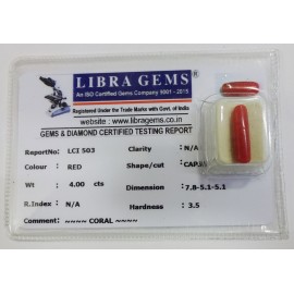 REPORT.NO.LCI 503CLARITY.N/ACOLOUR.REDSHAPE/CUT.CAPSULEWT.4.00 CTSDIMENSION.7.8-5.1-5.1R.INDEX.N/AHARDNESS.3.5COMMENT.CORAL..