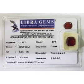 REPORT.NO.-LH 272CLARITY.-N/ACOLOUR.-COCA COLASHAPE/CUT.-OVALWT.-5.06 CTSDIMENSION.10.2-9.4-5.6R.INDEX.-1.92-2.02HARDNESS.-6.5-7.5COMMENT.-HESSONITE..