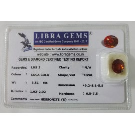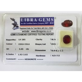 REPORT.NO.-LH 285CLARITY.-N/ACOLOUR.-COCA COLASHAPE/CUT.-OVALWT.-3.45 CTSDIMENSION.-9-4.8-1.5-2.R.INDEX.-1.92-2.02HARDNESS.-6.5-7.5COMMENT.-HESSONITE..