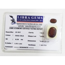 REPORT.NO.-LH 457CLARITY.-N/ACOLOUR.-COCA COLASHAPE/CUT.-OVALWT.-8.26 CTSDIMENSION.-5-6.1-2.4-8.R.INDEX.-1.92-2.02HARDNESS.-6.5-7.5COMMENT.-HESSONITE..