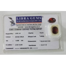 REPORT NO . LHS 14CLARITY . N/ACOLOUR . COCA COLASHAPE / CUT . OVALWT . 4.00 CTSDIMENSION . 10-4.8-4.5-8.R . INDEX . 1.92-2.02HARDNESS . 6.5-7.5COMMENT . HESSONITE { S }..