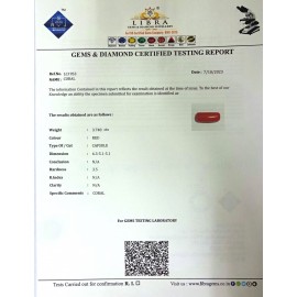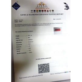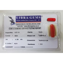 REPORT.NO. LCI 11CLARITY. N/ACOLOUR. REDSHAPE/CUT. CAPSULEWT. 6.28 CTSDIMENSION. 8.9-6.1-5.8R. INDEX. N/AHARDNESS. 3.5COMMENT. CORAL..