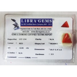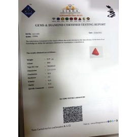 DATE: 11-4-2025REF.NO: LCI  1492NAME: CORALWEIGHT: 4.29 CTSCOLOUR: REDTYPE OF/CUT: TRIANGLEDIMENSION: 1.2-1.5-5.9/CONCLUSION: N/AHARDNESS: 3.5R.INDEX: N/ACLARITY: N/ASPECIFIC COMMENTS: CORAL ..