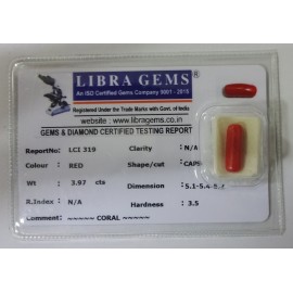 REPORT NO . LCI 319CLARITY . N/ACOLOUR . REDSHAPE / CUT . CAPSULEWT . 3.97 CTSDIMENSION . 5-1.5-4.5-2.R . INDEX . N/AHARDNESS . 3.5COMMENT . CORAL..