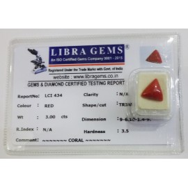 REPORT.NO.LCI 434CLARITY.N/ACOLOUR.REDSHAPE/CUT.TRIANGLEWT.3.00 CTSDIMENSION.9.6-10.1-4.9R.INDEX.N/AHARDNESS.3.5COMMENT.CORAL..