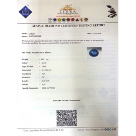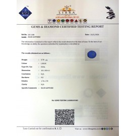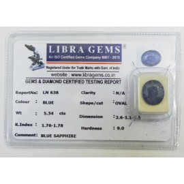 REPORT.NO.LN 638CLARITY.N/ACOLOUR.BLUESHAPE/CUT.OVAL WT.5.34 CTSDIMENSION.2.6-1.1-3.5R.INDEX.1.76-1.7.8HARDNESS.9.0COMMENT.BLUE SAPPHIRE..