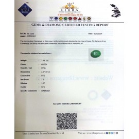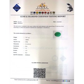 REPORT NO . LE 36CLARITY . N/ACOLOUR . GREENSHAPE / CUT . OVALWT . 5.89 CTSDIMENSION . 4-5.10-9.4-7.R . INDEX . 1.57HARDNESS . 7.5COMMENT . EMERALD..