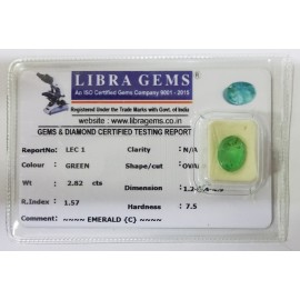 REPORT.NO.-LEC 1CLARITY.-N/ACOLOUR.-GREENSHAPE/CUT.-OVALWT.-2.82 CTSDIMENSION.-1.2-8.4-4.9R.INDEX.-1.57HARDNESS.-7.5COMMENT.-EMERALD {C}..