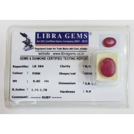 REPORT.NO.-LR 384CLARITY.-N/ACOLOUR.-PINKSHAPE/CUT.-OVALWT.-9.40 CTSDIMENSION.-3-8.1-1.6-1.R.INDEX.-1.76-1.78HARDNESS.-9.0COMMENT.-RUBY..
