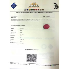 REPORT NO . LR 98CLARITY . N/ACOLOUR . PINKSHAPE / CUT . OVALWT . 5.05 CTSDIMENSION . 10-5.8-2.5-5.R . INDEX . 1.76-1.78HARDNESS . 9.0COMMENT . RUBY..