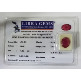 REPORT.NO.-LRA 83CLARITY.-N/ACOLOUR.-PINKSHAPE/CUT.-OVALWT.-4.63 CTSDIMENSION.-2.4-9.9-3.6R.INDEX.-1.76-1.78HARDNESS.-9.0COMMENT.-RUBY{A}..