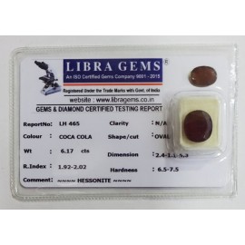 REPORT NO . LH 25CLARITY . N/ACOLOUR . COCA COLASHAPE / CUT . OVALWT . 6.36 CTSDIMENSION . 2-5.10-2.5-1.R . INDEX . 1.92-2.02HARDNESS . 6.5-7.5COMMENT . HESSONITE..