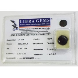 REPORT.NO.LH 504 CLARITY.N/A COLOUR.COCA COLA SHAPE/CUT.ROUNDWT.4.93 CTS DIMENSION. 10.4-10.2-5.1R.INDEX.1.92-2.02HARDNESS.6.5-7.5COMMENT.HESSONITE..