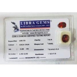REPORT NO . LHS 55CLARITY . N/ACOLOUR . COCA COLASHAPE / CUT . OVALWT . 3.88 CTSDIMENSION . 9-6.8-2.5-5.R . INDEX . 1.92-2.02HARDNESS . 6.5-7.5COMMENT . HESSONITE { S }..