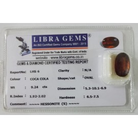 REPORT NO . LHS 6CLARITY . N/ACOLOUR . COCA OLASHAPE / CUT . OVALWT . 9.24 CTSDIMENSION . 5-3.10-1.6-9.R . INDEX . 1.92-2.02HARDNESS . 6.5-7.5COMMENT . HESSONITE { S }..