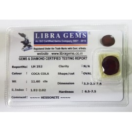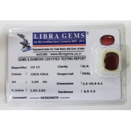 REPORT NO . LH 13CLARITY . N/ACOLOUR . COCA COLASHAPE / CUT . OVALWT . 5.04 CTSDIMENSION . 2-5.10-4.4-1.R . INDEX . 1.92-2.02HARDNESS . 6.5-7.5COMMENT . HESSONITE..