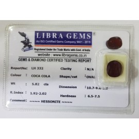 REPORT.NO.-LH 332CLARITY.-N/ACOLOUR.-COCA COLASHAPE/CUT.-OVALWT.-5.82 CTSDIMENSION.-10-7.9-6.5-9.R.INDEX.-1.92-2.02HARDNESS.-6.5-7.5COMMENT.-HESSONITE..