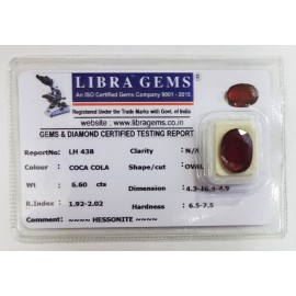 REPORT.NO.-LH 438CLARITY.-N/ACOLOUR.-COCA COLASHAPE/CUT.-OVALWT.-6.60 CTSDIMENSION.-4-3.10-4.4-9.R.INDEX.-1.92-2.02HARDNESS.-6.5-7.5COMMENT.-HESSONITE..