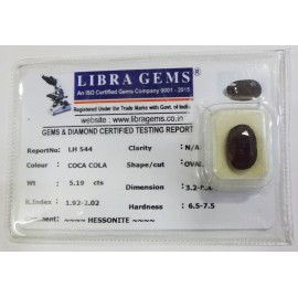 REPORT.NO.LH 544CLARITY.N/A COLOUR.COCA COLA SHAPE/CUT.OVAL WT.5.19 CTSDIMENSION. 3.2-8.4-5.5R.INDEX.1.92-2.02HARDNESS.6.5-7.5COMMENT.HESSONITE..