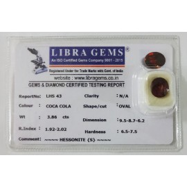 REPORT NO . LHS 43CLARITY . N/ACOLOUR . COCA COLASHAPE / CUT . OVALWT . 3.86 CTSDIMENSION . 9-5.8-7.6-2.R . INDEX . 1.92-2.02HARDNESS . 6.5-7.5HARDNESS . HESSONITE { S }..