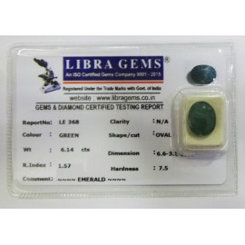 REPORT.NO.LE 368CLARITY.N/ACOLOUR.GREENSHAPE/CUT.OVALWT.6.14 CTSDIMENSION . 6-6.3-1.10-4.R.INDEX.1.57HARDNESS.7.5COMMENT.EMERALD..
