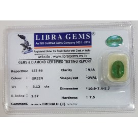 REPORT NO . LEJ 46CLARITY . N/ACOLOUR . GREENSHAPE / CUT . OVALWT . 3.12 CTSDIMENSION . 10-9.7-4.5-7.R . INDEX . 1.57HARDNESS . 7.5COMMENT . EMERALD ( J )..