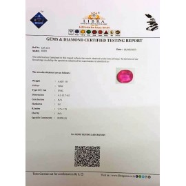 DATE:18-8-2023REF.NO:LRA 164NAME:RUBYWEIGHT:6.62 CTSCOLOUR:PINKTYPE OF/CUT:OVALDIMENSION:4-1.10-7.4-5.CONCLUSION:N/AHARDNESS:9.0R.INDEX:1.76-1.78CLARITY:N/ASPECIFIC COMMENTS: RUBY { A }..