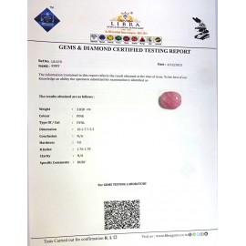 REPORT NO . LR 135CLARITY . N/ACOLOUR . PINKSHAPE / CUT . OVALWT . 3.68 CTSDIMENSION . 10-2.7-5.4-5.R . INDEX . 1.76-1.78HARDNESS . 9.0COMMENT . RUBY..