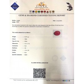 REPORT NO . LRA 65CLARITY . N/ACOLOUR . PINKSHAPE / CUT . OVALWT . 4.52 CTSDIMENSION . 1-9.9-9.4-3.R . INDEX . 1.76-1.78HARDNESS . 9.0COMMENT . RUBY { A }..