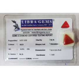 REPORT NO . LCI 122CLARITY . N/ACOLOUR . REDSHAPE / CUT . TRIANGLEWT . 4.51 CTSDIMENSION . 2-1.2-1.5-2.R . INDEX . N/AHARDNESS . 3.5COMMENT . CORAL..