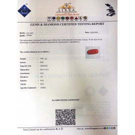 REPORT.NO.LCI 755CLARITY.N/ACOLOUR.REDSHAPE/CUT.CAPSULEWT.6.75 CTSDIMENSION.8.6-7.1-6.1R.INDEX.N/AHARDNESS.3.5COMMENT.CORAL ..