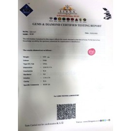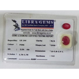 REPORT NO . LR 144CLARITY . N/ACOLOUR . PINKSHAPE / CUT . OVALWT . 3.56 CTSDIMENSION . 10-5.8-2.4-1.R . INDEX . 1.76-1.78HARDNESS . 9.0COMMENT . RUBY..