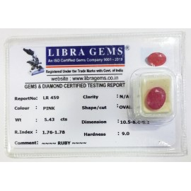 REPORT.NO.LR 459CLARITY.N/ACOLOUR.PINKSHAPE/CUT.OVALWT.5.43 CTSDIMENSION.10.5-8.4-6.1R.INDEX.1.76-1.78HARDNESS.9.0COMMENT.RUBY..