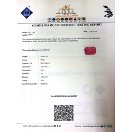 DATE:7-10-2023REF.NO:LRA 194NAME:RUBYWEIGHT:4.30 CTSCOLOUR:PINKTYPE OF/CUT:RECTANGLEDIMENSION:1-5.7-6.4-1.CONCLUSION:N/AHARDNESS:9.0R.INDEX:1.76-1.78CLARITY:N/ASPECIFIC COMMENTS:RUBY { A }..