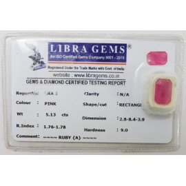 REPORT NO . LRA 5CLARITY . N/ACOLOUR . PINKSHAPE / CUT . RECTANGLEWT . 5.13 CTSDIMENSION . 2-8.8-4.3-9.R . INDEX . 1.76-1.78HARDNESS . 9.0COMMENT . RUBY { A }..
