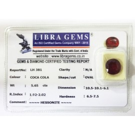 REPORT.NO.-LH 381CLARITY.-N/ACOLOUR.-COCA COLASHAPE/CUT.-OVALWT.-5.65 CTSDIMENSION.-10-5.10-1.6-1.R.INDEX.-1.92-2.02HARDNESS.-6.5-7.5COMMENT.-HESSONITE..