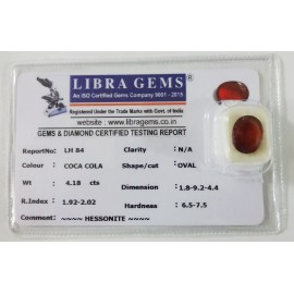 REPORT NO . LH 84CLARITY . N/ACOLOUR . COCA COLASHAPE / CUT . OVALWT . 4.18 CTSDIMENSION . 1-8.9-2.4-4.R . INDEX . 1.92-2.02HARDNESS . 6.5-7.5COMMENT . HESSONITE..
