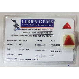 REPORT.NO.LCI 544CLARITY.N/ACOLOUR.RED SHAPE/CUT.TRIANGLEWT.8.07 CTS DIMENSION.5.2-4.4-6.6R.INDEX.N/AHARDNESS.3.5COMMENT.CORAL ..