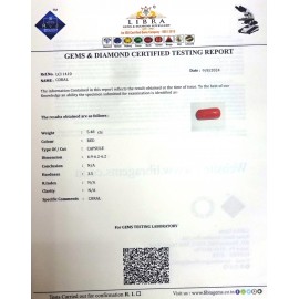 REPORT.NO.LCI 750CLARITY.N/ACOLOUR.REDSHAPE/CUT.CAPSULEWT.7.73 CTSDIMENSION.9.8-7.2-6.1R.INDEX.N/AHARDNESS.3.5COMMENT.CORAL ..