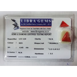 REPORT NO . LCI 124CLARITY . N/ACOLOUR . REDSHAPE / CUT . TRIANGLEWT . 4.45 CTSDIMENSION . 2-2.1-6.5-2.R . INDEX . N/AHARDNESS . 3.5COMMENT . CORAL..