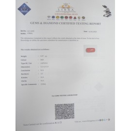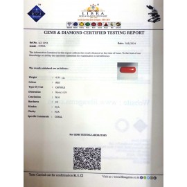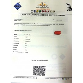 DATE: 11-4-2025REF.NO: LCI  1499NAME: CORALWEIGHT: 4.47 CTSCOLOUR: REDTYPE OF/CUT: CAPSULEDIMENSION: 5.2-6.3-5.9/CONCLUSION: N/AHARDNESS: 3.5R.INDEX: N/ACLARITY: N/ASPECIFIC COMMENTS: CORAL ..