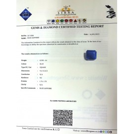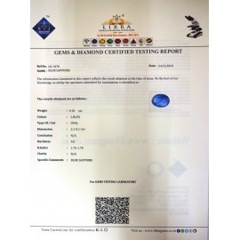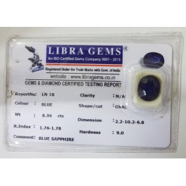 REPORT NO . LN 18CLARITY . N/ACOLOUR . BLUESHAPE / CUT . OVALWT . 8.36 CTSDIMENSION . 2-2.10-2.6-8.R . INDEX . 1.76-1.78HARDNESS . 9.0COMMENT . BLUE SAPPHIRE..