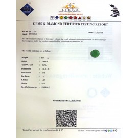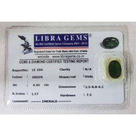 REPORT NO . LE 104CLARITY . N/ACOLOUR . GREENSHAPE / CUT . OVALWT . 4.45 CTSDIMENSION . 2-5.8-8.6-2.R . INDEX . 1.57HARDNESS . 7.5COMMENT . EMERALD..