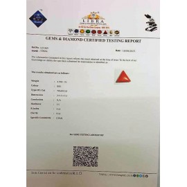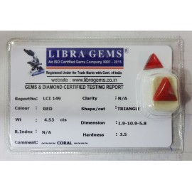 REPORT NO . LCI 149CLARITY . N/ACOLOUR . REDSHAPE / CUT . TRIANGLEWT . 4.53 CTSDIMENSION . 1-9.10-9.5-8.R . INDEX . N/AHARDNESS . 3.5COMMENT . CORAL..